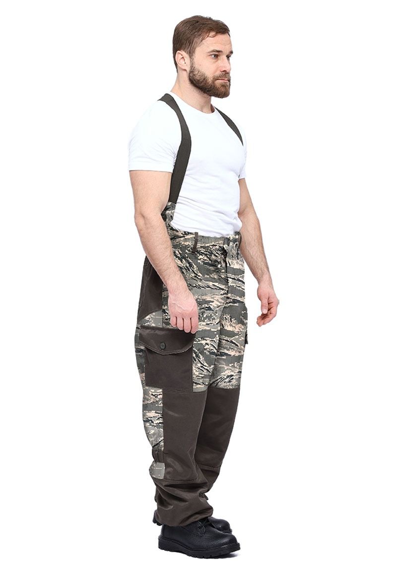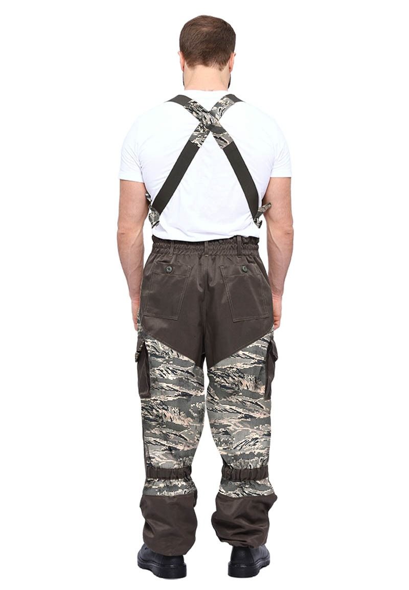 Экипировка работников охранных структур. У брюк высокий пояс с петлями для широкого ремня. Имеется пуговичная застёжка, гульфик на молнии. Брюки снабжены бретелями, которые регулируются с помощью эластичной тесьмы и карабинов. На брючинах в области бёдер – боковые накладные карманы с клапаном, застёгивающимся на кнопку. По низу брючин – вертикальные застёжки-молнии, благодаря которым можно носить данную модель с различными видами обуви.