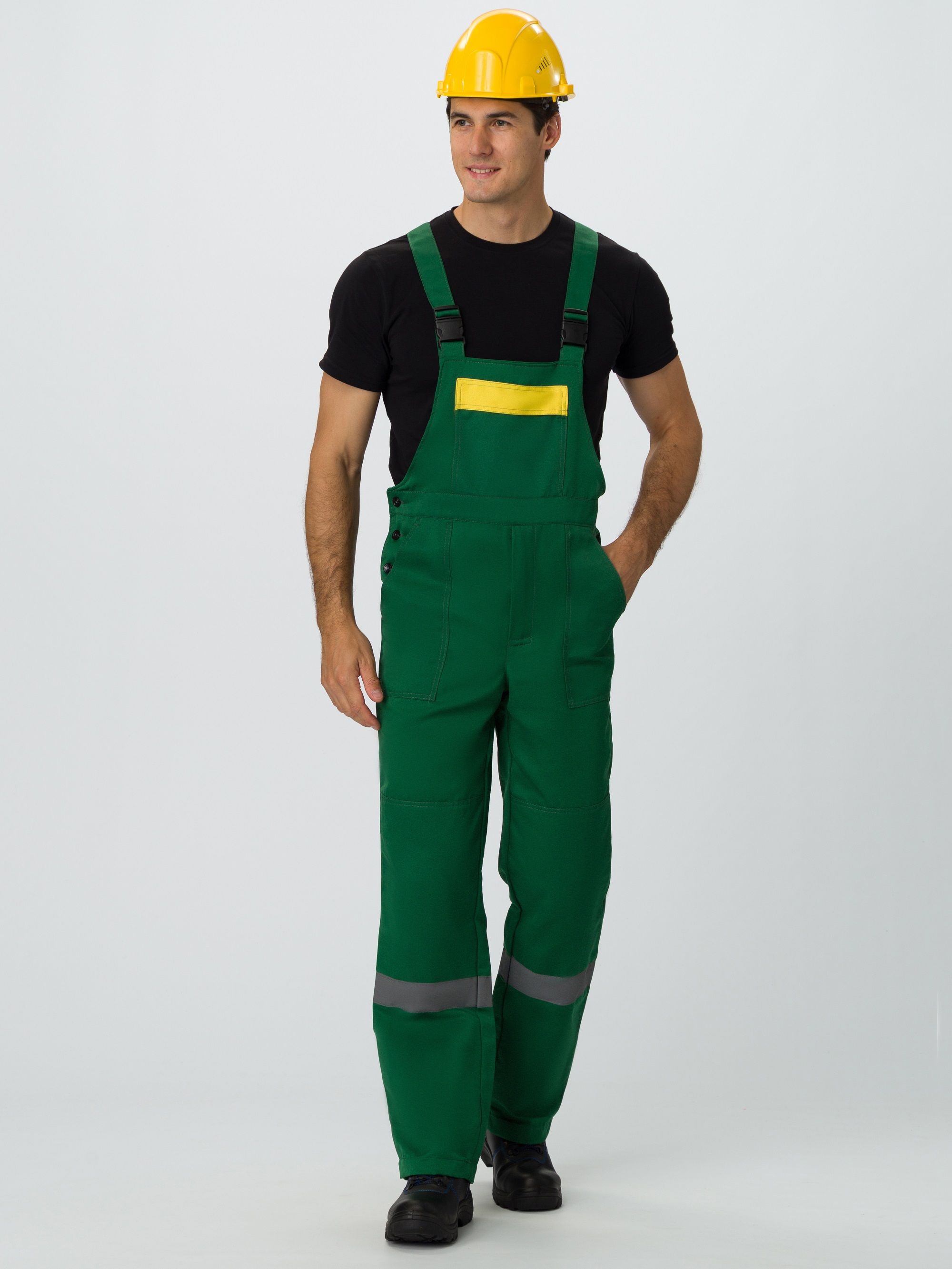 Куртка: четыре кармана для инструментов, отложной воротник, притачной пояс стянут по бокам эластичной тесьмой, по кокетке спинки, полочки и низу брюк - лента СОП 50 мм. Полукомбинезон: передняя застежка на пуговицы, застежка в боковом шве на пуговицы, бретели с фастексами, накладные карманы, по низу световозвращающая полоса СОП 50 мм.