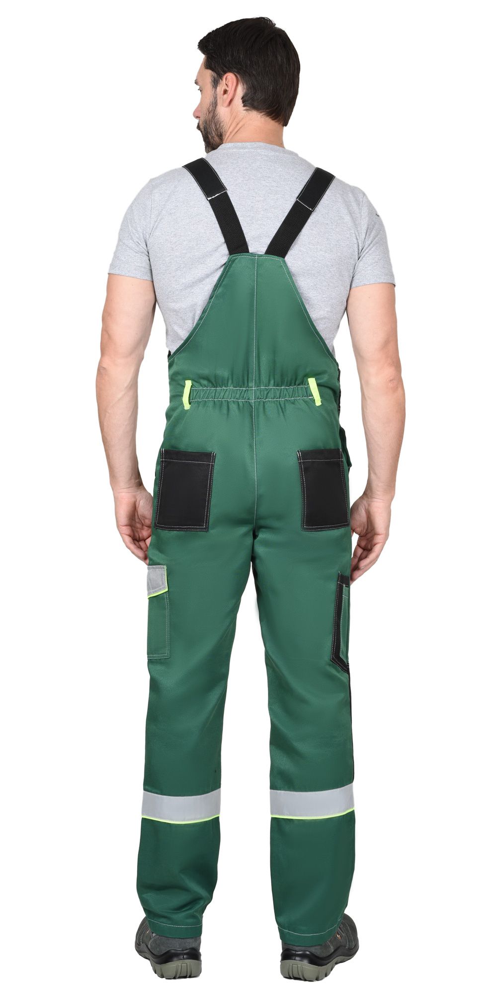 Полукомбинезон с застежкой на пуговицы: гульфик и левая боковая застежка. На грудке комбинированный карман с клапаном, застегивается на липучку и кнопку. Передние половинки с боковыми карманами и наколенниками. На левом боковом шве передних половинок накладной карман с клапаном, застегивается на липучку и кнопку. Задние половинки с накладными карманами и карманами для инструментов. По спинке резинка для лучшего прилегания. Полукомбинезон с бретелями, длина регулируется резинкой и застежкой-фастексом.