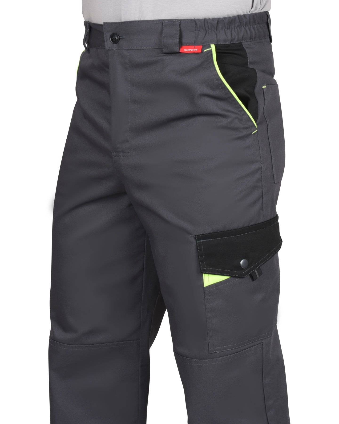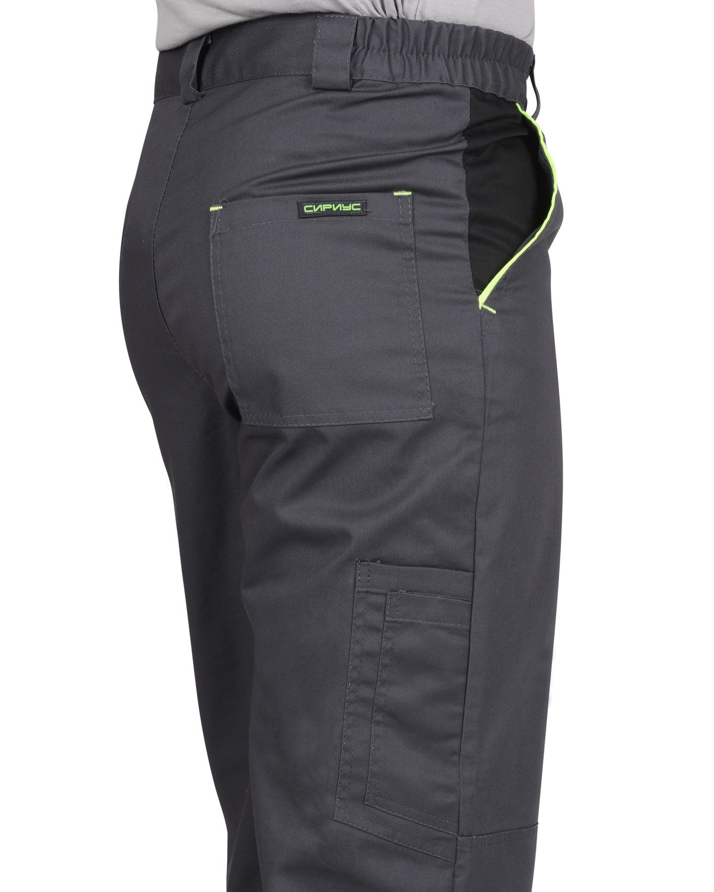 Брюки прямые, с застежкой спереди на тесьму "молния", с притачным поясом, с частичной стяжкой по бокам и застегивающимся на 1 петлю и 1пуговицу, с 5 шлевками, с внутренними боковыми карманами и наколенниками, с накладным карманом на левом боковом шве с клапаном с патой на кнопке, с двумя задними накладными карманами и карманами для инструментов.
