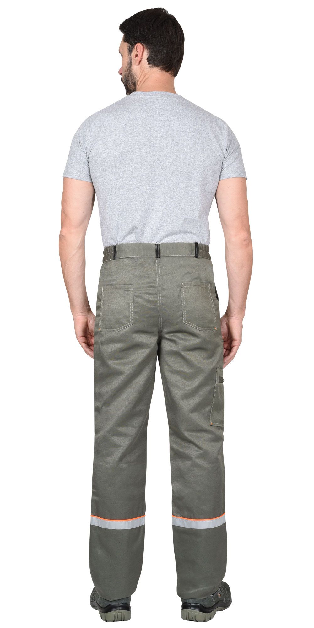 Брюки прямые, на притачном поясе с резинкой ткацкой по боковым швам, застёгивающимся на петлю и пуговицу, с 5-ю шлевками, с застёжкой гульфика на молнию, с накладными боковыми и задними карманами и карманом на правом боковым шве, с наколенниками. В брюках предусмотрен кант контрастного цвета и ленты светоотражающей СОП (мелкодисперсной белой) ш.25 мм для обозначения сигнальной видимости.