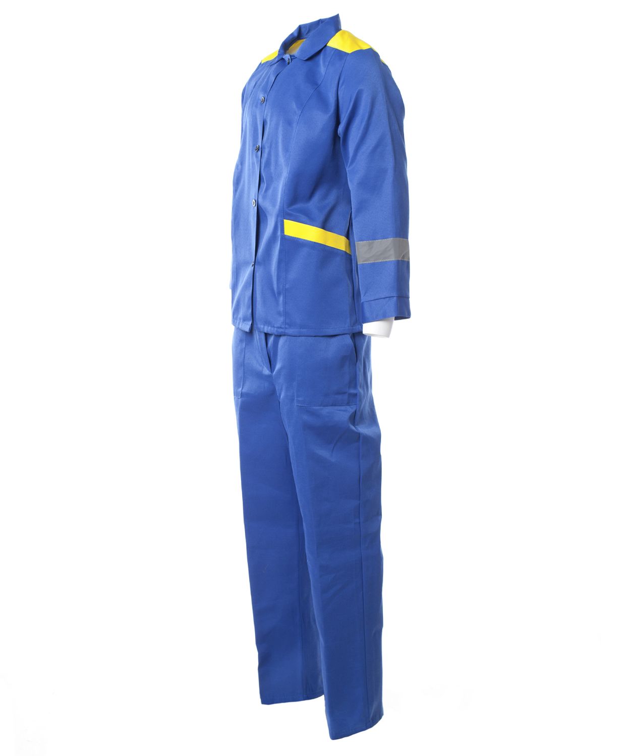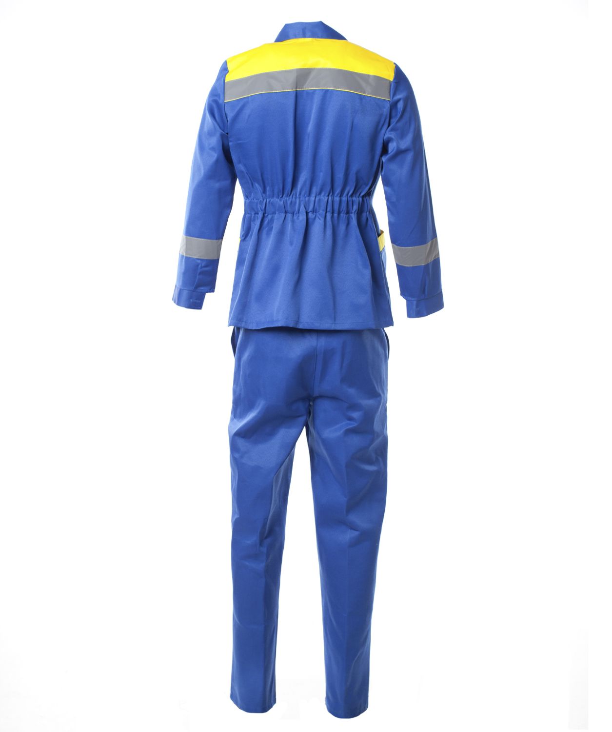 Куртка: четыре кармана для инструментов, отложной воротник, притачной пояс стянут по бокам эластичной тесьмой, по кокетке спинки, полочки и низу брюк - лента СОП 50 мм. Полукомбинезон: передняя застежка на пуговицы, застежка в боковом шве на пуговицы, бретели с фастексами, накладные карманы, по низу световозвращающая полоса СОП 50 мм.