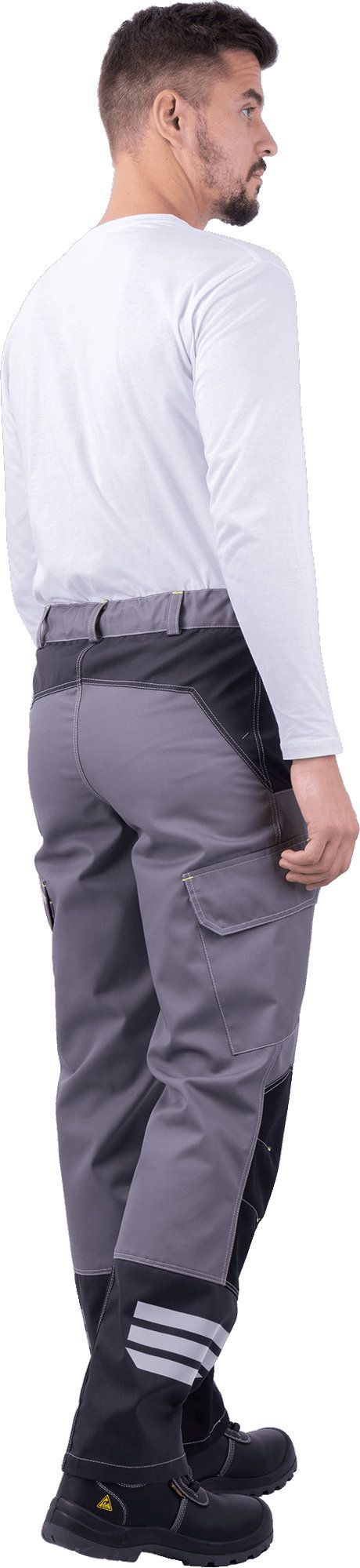 Мужской рабочий халат. Силуэт прямой. Без пояса. Отделка контрастного цвета на кокетке и внутренней части центральной планки. На кокетке по нижнему срезу – светоотражающий кант. Воротник отложной. Центральная застёжка сквозная, пуговичная. Рукава оснащены манжетой с пуговичной застёжкой. Есть две пары карманов накладного типа: на груди (один с отстроченным отделением для мобильного телефона и клапаном), большие боковые.